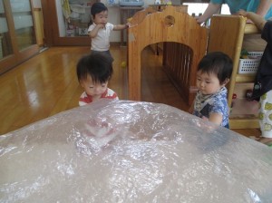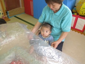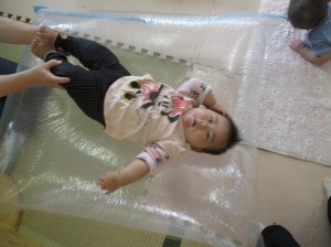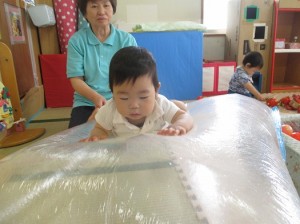 2017年06月09日 圧縮袋で遊ぼう 0歳児 はな 圧縮袋に空気を入れて遊びました。 触ってみたいけど、これはなんだろうと少し怖がって目を丸くしたり、少し触ってみては保育者のそばに来たりしていました。 慣れてくると自分で圧縮袋に乗せた身体を揺らしてみていました。 今回は空気を入れて楽しみましたが、次は何をいれてみようと考えています。 一覧へ戻る