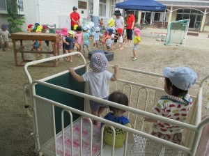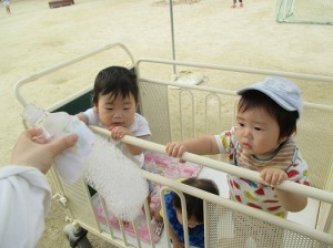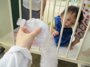 2017年07月06日 何をしているのかな? 0歳児 はな にじぐみさんが水あそびを始めると散歩車から様子をうかがうこどもたち。 バギーに乗っている子も少し気にしているようでした。 今度はゆきぐみさんがしているシャボン玉あそびを見に行きました。 泡が出てくる様子を不思議そうに眺めたり、手を伸ばして触ってみようとしたりしていました。 一覧へ戻る
