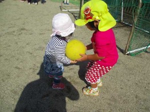 今日は園庭にでかけました。靴を履いて歩くことにも慣れて自分で好きなところに行ってみていました。すると「はなぐみさん、かわいい~」とにじぐみの女の子が来てくれて、何かしてあげようとボールをくれました。