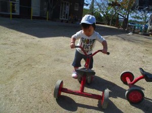 ある子は三輪車を見つけて一生懸命ハンドルを押してみています。