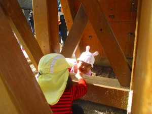 ハイハイの子は滑り台下の小さなスペースに隠れているお友だちを発見して「ばぁ」と言わんばかりに顔をのぞかせています。