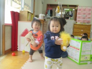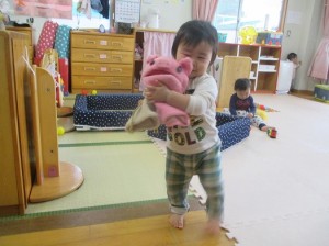 2017年11月09日 えんやらりんごの木 0歳児 はな パペットを抱いてえんやらりんごの木が上手にできるようになりました。以前は保育者がこどもを抱っこしてしていたのを、今はこどもたちがパペットにしています。ギューと抱っこしてうたに合わせてリズムをとる子、うたより先取りして高い高いをする子、ぐるぐる回ってパワフルなえんやらりんごの木をする子さまざまでした。 一覧へ戻る