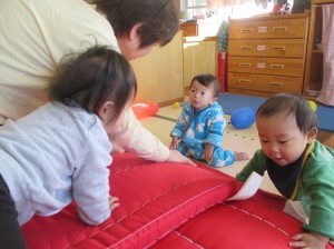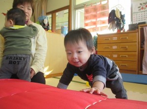 2017年11月24日 登って降りて 0歳児 はな 牛乳パックの囲いに上にマットを十字にのせて山にして遊びました。 マットの取っ手が気になり引っ張り出してみる子、マットの上に寝転がる子、登って降りてを繰り返し楽しむ子とそれぞれが遊んでいました。 「おいで」と声をかけると一生懸命登ってみようと挑戦している子もいました。 できることや興味のあることが増えてきているこどもたち。たくさんの経験ができたらと思います。 一覧へ戻る