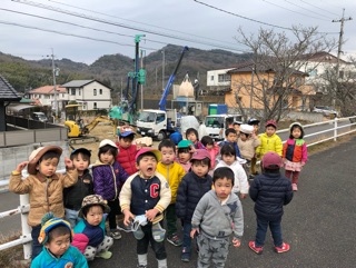2019年01月25日 見に行こう 2歳児 にじ あいさつ道路の近くにたくさんの重機があったので見に行きました。 ゆっくり動いたり、クレーン車が大きな袋を持ち上げる姿をじっと観察していました。 最後に記念写真を撮りテンションが上がるこどもたちでした。 かっこいいでしょ 一覧へ戻る
