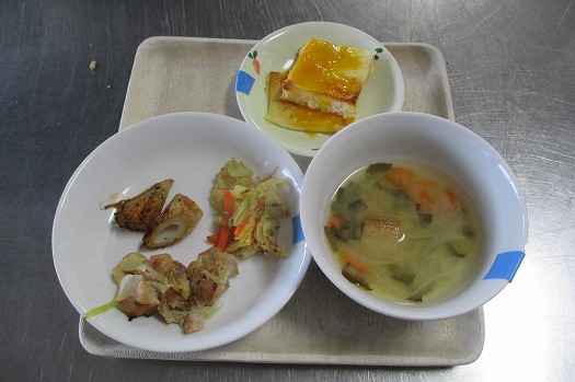 今日のおたのしみおやつはフレンチトーストです。その上からみかん缶を煮詰めてソースにしたものをかけました。こどもたちにも人気でよく食べていました。