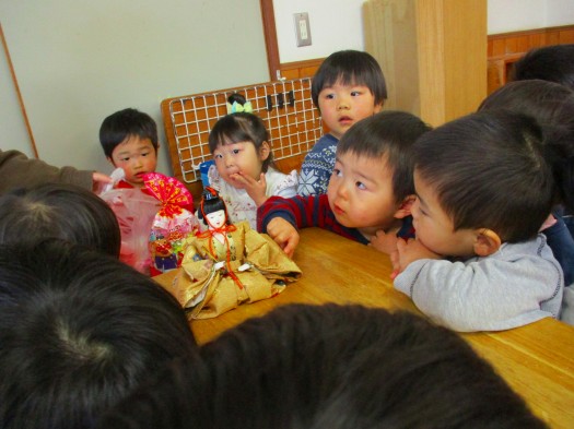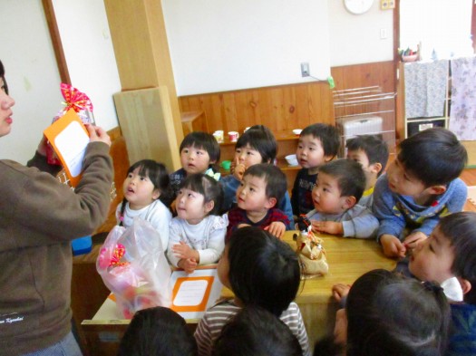 2019年03月01日 みーつけた! 2歳児 にじ 今日は、誕生会(ひなまつり)に参加しました。 誕生会の後、雛人形の五人囃子の一人を探して楽しみました。 どこに隠れていたかというと…なんと!にじぐみの押し入れの中でした! 押し入れの中に隠れている人形を見つけると、そのそばにひなあられと甘酒(カルピス)引換券が入っている袋もありました。 カルピスはすぐに飲んで、ひなあられは給食の時に食べました。 楽しかったね。 一覧へ戻る