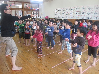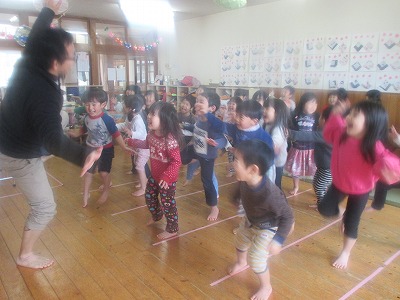 2019年03月04日 弁慶 3歳児 つき 「弁慶」というあそびをしました。 ♪べんけいが ごじょうのはしを わたるとき うんとこどっこいしょ! うんとこどっこいしょ! うんとこどっこいどっこいしょと いってわたる という歌詞に合わせて全身を 動かして遊ぶのですが、これが大盛り上がり。 特に「うんとこどっこいしょ」のところで 左右に動くのですが、そこで大笑いするこどもたち。 なかなか文章では伝えづらいので、 ぜひお子さんにやってもらってください!^^ 一覧へ戻る