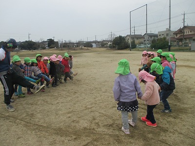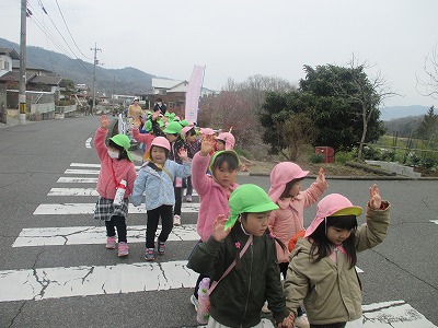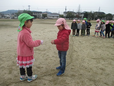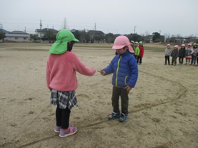 2019年03月06日 ほし・つきぐみと一緒に 3歳児 つき 4歳児 ほし 今日は、つきぐみとほしぐみと一緒に4丁目グランドまで散歩に行きました。 つきぐみは、ほしぐみのリードしてくれる姿を見て真似して歩いたり、ほしぐみは、交通ルールを守りながら自分の体やつきぐみを守って散歩したりする姿がありました。 グランドでは、つきぐみがしたことのない「はないちもんめ」と「どんじゃんけん」の集団あそびを教えてあげました。 何度か一緒にあそんでいると覚えてきてじゃんけんのやりとりを楽しんだり、どっちが勝つか競い合ったりとあそびを十分に楽しむ姿がありました。 一覧へ戻る