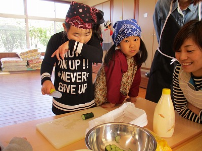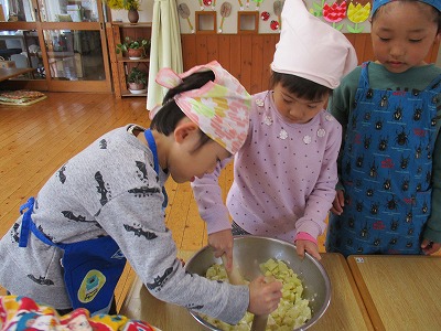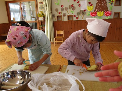 2019年03月08日 お弁当作り 5歳児 そら 今日は健脚活動でお弁当作りをしました。 メニューはからあげ、マカロニサラダ、オムレツ、じゃがチーズです。 からあげは給食室で揚げてもらい、後はグループに分かれて作っていきました。 マックスバリューで買った食材を使って切ったり剥いたり もうすっかりクッキングに慣れてきています。 完成した後は近くのどんぐり公園に行き(おかわりも持って) みんなでお弁当を食べました。 一覧へ戻る