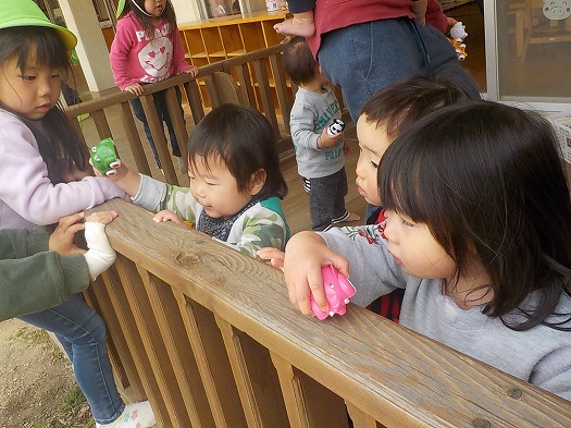 2019年04月05日 テラスで 1歳児 ゆき 今日はテラスでお花見をしたり、動物の車をはしらせたりしてあそびました。 動物の車をテラスの手すりで動かしてあそんだり、保育者の足で作ったトンネルの間を通したりしてあそびました。 まだ新年度が始まったばかりで、涙も多く見られますが、 これからたくさん楽しいあそびをして、少しずつ慣れていこうね。 一覧へ戻る