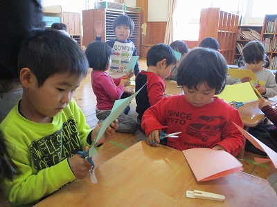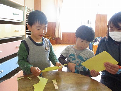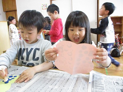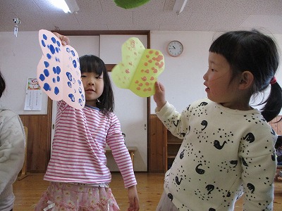 2019年04月10日 パッと開くと… 4歳児 ほし 製作でちょうちょを作りました。 まずは画用紙を半分にしたものを 半分に切って…開くと… 「わあ、ちょうちょ!」と思わずにっこり。 そして、 デカルコマニーという技法を使って ちょうちょの模様をつけました。 またまた開くと… 「かわいくなった」「きれいになった」と 喜んでいましたよ♪ 保育室に飾っているので見てくださいね。 一覧へ戻る