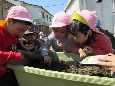 2019年04月13日 百日草 3歳児 つき 百日草の種を蒔きました。 自分たちでプランターに土を入れ、 種を蒔いていると あらあらお客さんが。 これから水やりをして大切に育てていきたいと思います。 一覧へ戻る