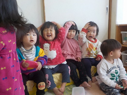 2019年04月12日 ここです、ここです♪ 1歳児 ゆき 先日、保育室で手遊びや歌で遊びました。 「〇〇ちゃんはどこでしょう」「かえるのうた」などの知っている歌をしていると、保育者の真似をして同じ動きをしたり、歌に合わせて身体を動かしたりしているこどもたちです。 保育者や友だちと一緒にすると楽しくて、「キャー!」と大喜びでした。 手遊びや歌は、自然と笑顔になる魔法のあそびだと感じました。 楽しかったね。また歌や手遊びであそぼうね。 一覧へ戻る