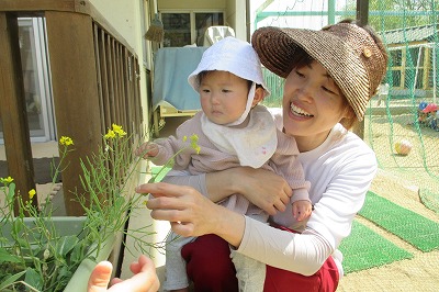 2019年04月22日 春を感じて 0歳児 はな 今日は、暖くちょっぴり外へ。 菜の花や、カラスノエンドウなどを見つけると、じっと観察。 時に手を伸ばして振れる場面もありました。 いろいろな自然がたくさんあるね。 一覧へ戻る