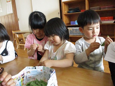 みんなでお手伝いをしたスナップエンドウが給食で出るのが楽しみだね♪