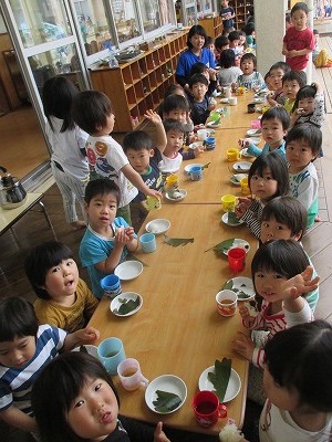 2019年04月26日 おいしいね 3歳児 つき 先日、おやつで柏餅がでたので、テラスに出て 大きなこいのぼりを眺めながら食べました。 いつもとは違う雰囲気に喜んでいたこどもたちです。 またテラスで食べようね。 一覧へ戻る