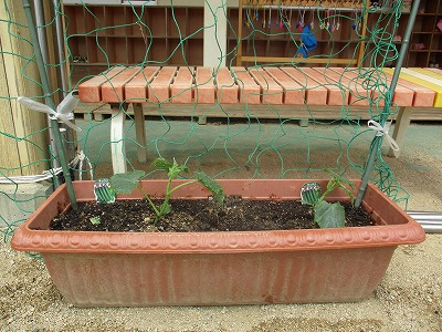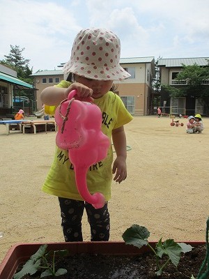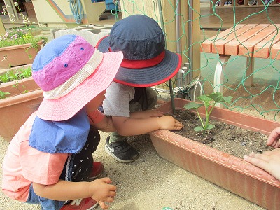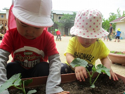 2019年05月16日 おいしい夏野菜ができますように! 2歳児 にじ プランターにきゅうり、畑になすの苗を植えました。 保育者と一緒に穴に苗を植えたり、そっと土をかけたりしていたこどもたち。 中には、苗が気になりすぎて先に植えていた苗を思わず抜いてしまう子もいました。 植えた後はしっかり水やりも忘れずに! これからもこどもたちと一緒に水やりなど世話をしながら 夏野菜の成長を見守っていきたいと思います。 夏には、きゅうりとなすがたくさん収穫できるかな? こどもたちと一緒にクッキングをするのが今から楽しみです♪ 一覧へ戻る