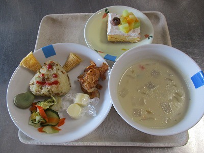 今日は5月誕生会メニューです。5月にちなんでかぶとやこいのぼりをイメージしました。こいのぼりはスポンジケーキに生クリームをぬって目はチョコワ、うろこはメロン、桃、みかんなどの果物を小さく切りました。みんなとても喜んでいてよく食べていました。