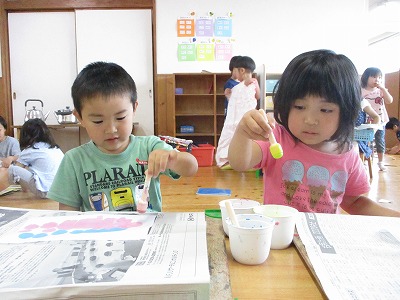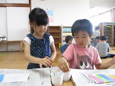 2019年05月28日 絵の具を使って… 4歳児 ほし 今日は絵の具を使って、あじさいの製作をしました。 タンポで半紙に色を付けると、色が混ざって紫や緑色に変わることが面白かったようで「あ、紫になった!」と喜ぶ姿もありました☆ また、保育室に飾ろうと思うので見てみてくださいね♪ 一覧へ戻る