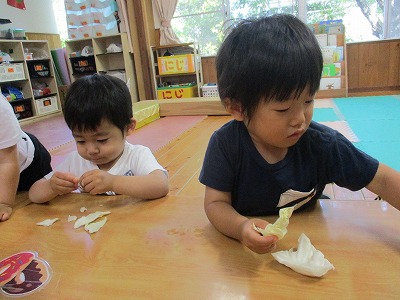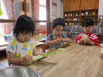 2019年05月31日 ちぎちぎぱっぱ! 2歳児 にじ 給食室の手伝いで、キャベツちぎりをしました。 「これ、なんだ?」とキャベツを見せると 「キャベツ」と自信満々に答えていたこどもたち。 みんなで「ちぎちぎぱっぱ」と言いながら あっという間に全部ちぎり終わりました。 ちぎったキャベツは給食室で茹でてもらい 昼ご飯のキャベツのもみ漬けになり、 おいしくいただきました(^u^) 今度は何の手伝いをしようかな? 手伝い大好きなにじ組のこどもたち。 家でも手伝いを頼むとはりきって手伝ってくれると 思うので一緒にしてみてくださいね♪ 一覧へ戻る