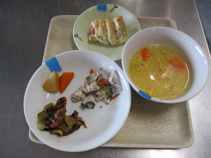 2019年06月14日 給食室(今日の昼食・おやつ) 給食室 昼食 ・麦ごはん ・レバニラ炒め ・大根の煮物 ・キャベツのゆかり和え ・卵のみそ汁 おやつ ・くるくるウインナー レバニラ炒めは豚レバーと豚小間切れ肉を片栗粉をつけて揚げ、ニラと玉葱を甘辛く炒めたものと合わせています。3歳未満は特にビタミンAが不足がちなので保育園では月に1回、レバーを献立に取り入れています。揚げると臭みもなく、こどもも食べやすいです。 一覧へ戻る