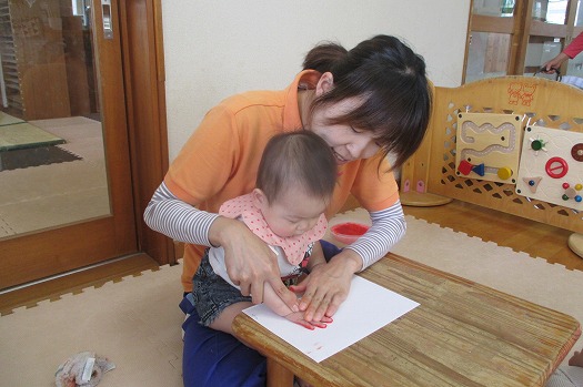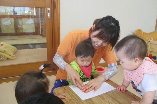 2019年06月17日 ぺったん 0歳児 はな 絵の具をつけてペッタン。 絵の具のヌルヌルとした感触に不思議そうなこどもたちは 眉間にしわを寄せてじっと自分の手を見つめています。 友だちがしていると、近寄ってはもう一回とばかりに手を伸ばしているこどもたちです。 一覧へ戻る