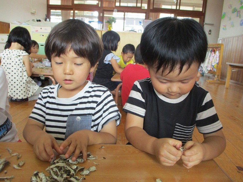 2019年06月24日 給食室のお手伝い 4歳児 ほし 今日は給食室のお手伝いで、いりこの内臓をとりました。 「頭をとって、中の黒いところをとるんだよ」と伝えると、「これであってる?」「どこどこ?」と保育者に確認する姿がありました。 たくさんのいりこも、ほしぐみさんのおかげであっという間にできました。 また、お手伝いよろしくね♪ 一覧へ戻る