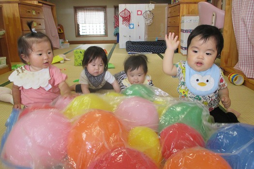 2019年06月24日 0歳児 はな 大きな風船布団。色鮮やかで魅力的に感じたのかみんなすぐに近くへ。 保育者がたたいて見せると、真似してぺちぺちたたいていました。 ガサガサしている感触に低月齢児もニッコリです。 一覧へ戻る