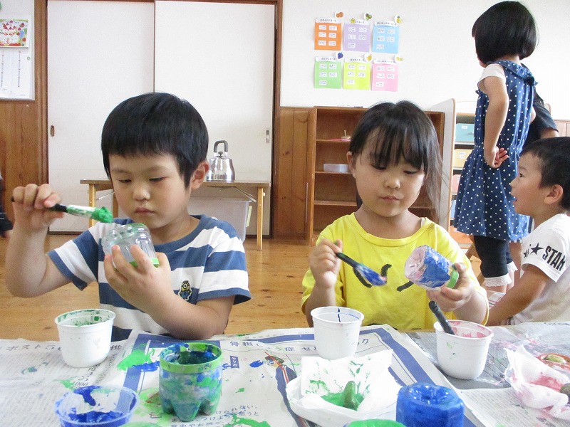 2019年06月28日 絵の具を使って… 4歳児 ほし 絵の具でペットボトルに色をつけました。 それぞれ綺麗な模様になっています♪ また、野菜スタンプも楽しみました。 丘っこまつりに飾る風鈴になります。 お楽しみに…☆ 一覧へ戻る