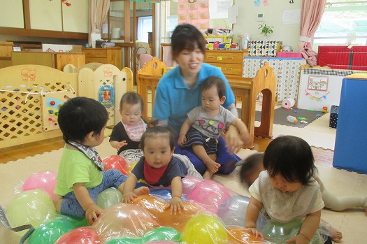 色鮮やかで、作っている時から興味を持って近くに来ているこどもたちです。保育者が横になってみたり、たたいてみたりすると、嬉しそうに真似してたたいていました。