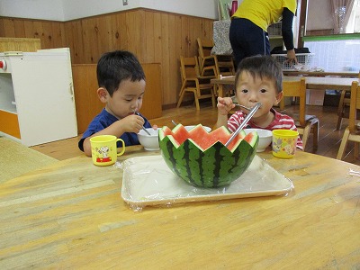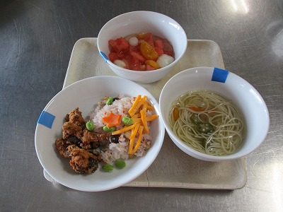 2019年07月05日 給食室(今日の昼食・おやつ) 給食室 昼食 ・天の川寿司 ・鶏肉の塩麹唐揚げ ・そうめん汁 おやつ ・すいかポンチ 今日は7月の誕生会献立です。寿司は錦糸卵を使って天の川をイメージしました。すいかポンチはすいかを器のしています。こどもたち大喜びでした!! 一覧へ戻る