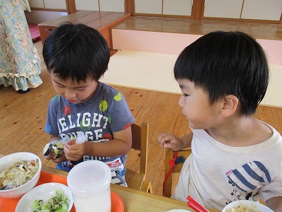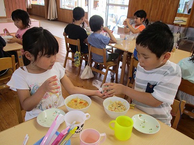 2019年07月05日 茄子の塩もみ 5歳児 そら いただいた茄子で塩もみをしました。 グループに一袋、切った茄子と塩を入れてもんでもらいました。 「おいしくなあれ」といいながらしていましたよ。 出来あがると「おいしい」とパクパク食べていたこどもたちでした。 今年はそらぐみできゅうりとトマトを育てています。 花が咲いて実がなってきていて「早く食べたいな」と楽しみにしているこどもたち。 自分たちで育てた夏野菜を食べて今年の夏も元気に過ごしたいです! 一覧へ戻る