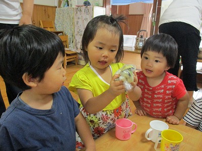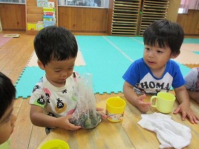 2019年07月06日 きゅうりの塩もみ♪ 2歳児 にじ 畑の野菜が収穫でき始め、毎日楽しみにしているこどもたち&職員です。 この日もなすときゅうりを朝のおやつ前に収穫♪塩やゆかりを入れてみんなでもみもみ… みんなでおいしくいただきました。味噌汁の具として給食に入れてもらうこともあり「みんなのなすびだ~」と喜んで食べています。 早く食べた~い おいしくなあれ! 一覧へ戻る