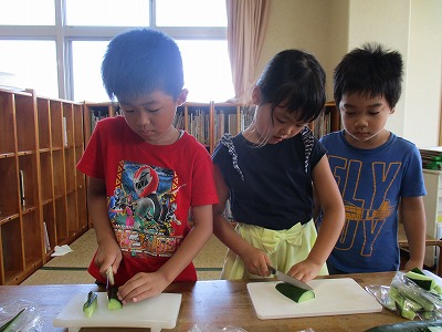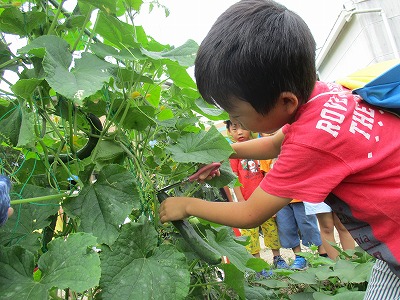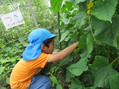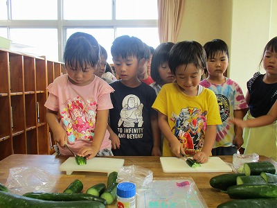 2019年07月16日 待ってました! 5歳児 そら 今日はそらぐみで育てているキュウリを収穫しました。 3連休で大きく育った(育ちすぎた)きゅうりたち。 「早く食べたい」「楽しみじゃな」と収穫しました。 一人ずつ包丁を使って切りました。 押さえる手は猫の手にすることをよく分かっていて 慎重に切っていましたよ。 グループで一袋作り、しっかり揉んで給食でいただきました。 「おいしい」「たくさんあるね」とあっという間に食べていました! たくさん収穫できたので他のクラスにもおすそ分けしました。 まだまだこれからたくさん収穫していきたいと思います。 一覧へ戻る