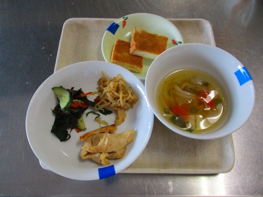 今日の和え物は手作り青じそドレッシングです。青じそをペーストにし、しょうゆ、サラダ油、酢、砂糖などを混ぜて作っています。市販のものに比べ添加物が無く、酸味も少ないのでこどもたちも食べやすかったようです。