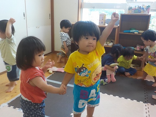 2019年07月30日 ダンスダンス♪ 1歳児 ゆき 今日は、テラスや室内で遊びました。 室内では、踊りを踊って遊びました。 すると、何故か友だちと手を繋いで踊ろうとするこどもたち。 自分から手を差し出し、手を繋ぐと、繋いだままノリノリで踊っていました。 友だちと踊ることが楽しかったようです。友だちを意識しているのでしょうね。 それを見て癒された保育者です(笑) 楽しかったね。またあそぼうね。 一覧へ戻る