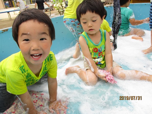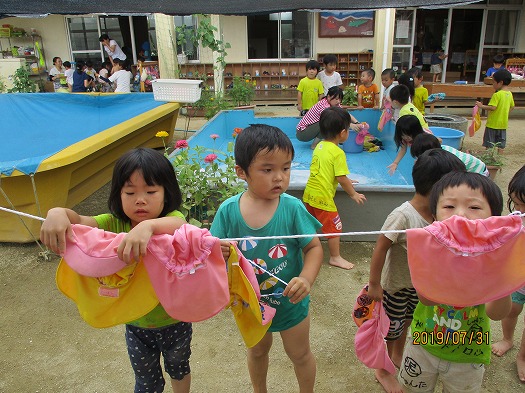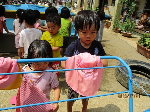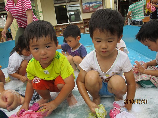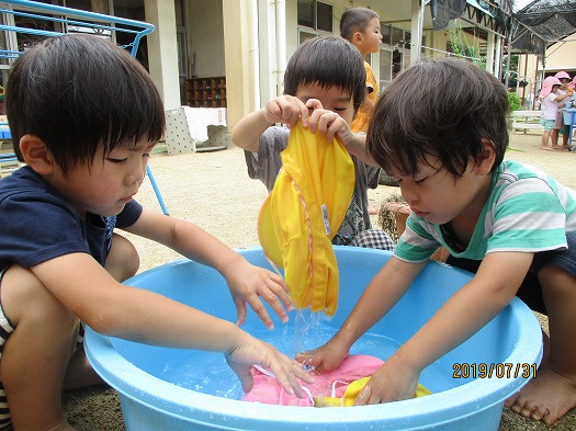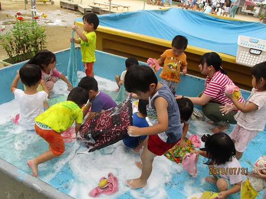 2019年07月31日 洗濯ごっこ 3歳児 つき プールを使って洗濯ごっこをしました。 自分たちの帽子とおままごとで使っているバンダナや服を洗いました。 レモン石鹸を手に持ちゴシゴシ! 「泡がでてきた~」「きれいになってきた」「いいによいがする」などと言った声が聞こえてきました。 楽しんで洗濯できた、つきぐみさん♪ 洗濯した後は、パンパンと叩いて干しました。 一覧へ戻る