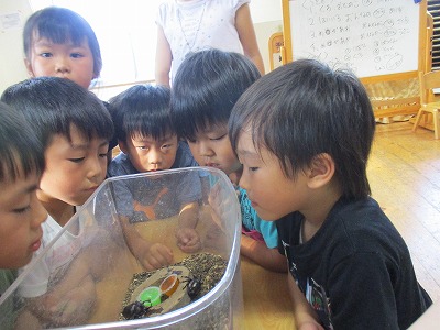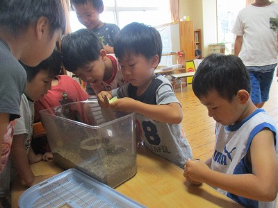 2019年07月31日 ご飯だよ 5歳児 そら ほし組から育てていたカブトムシの幼虫が成虫になっています。 「かっこいいな」と観察しています。 毎日の自然当番でカブトムシ用のゼリーをあげています。 「ごはんだよ」「あっ、食べた!」と喜んでいるこどもたちです。 メスもいるので卵が産まれないかな?と期待している担任です・・・。 一覧へ戻る