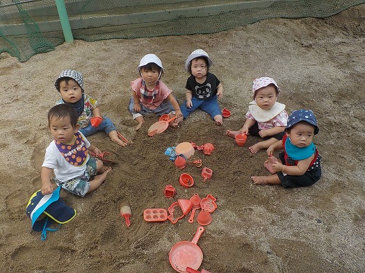 2019年08月07日 おーい! 0歳児 はな 部屋から砂場に移動してきたところ… 気が付けばみんな近くで半円になって遊んでいました。 あまりの可愛さに「おーい」と支援センターの職員が叫ぶと”え?”とこっちを向いたのでパチリ。 ”誰?”と不思議な表情のこどもたちです。 一覧へ戻る