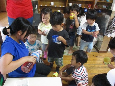 2019年08月24日 しそジュースのおすそわけ♪ 2歳児 にじ ある日のこと、おやつを終え、うがいをしていると、「にじぐみさん、しそジュース飲まない?」 とつきぐみからおすそわけがありました。 つきぐみがクッキングで作ったしそジュース。おいしくて、こどもたちもごくごくと飲んでいました。 つきぐみさんありがとう! おいし~い 一覧へ戻る