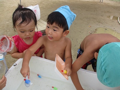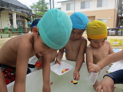 2019年08月09日 さかなすくい 2歳児 にじ 今日の水あそびでは、さかなすくいをしました。スプーンを使って上手にさかなをすくっている…と思いきや、手づかみの子も。入れる用にトレー用意していましたが、ペットボトルのせまい口に上手に入れている子もいました。 一覧へ戻る