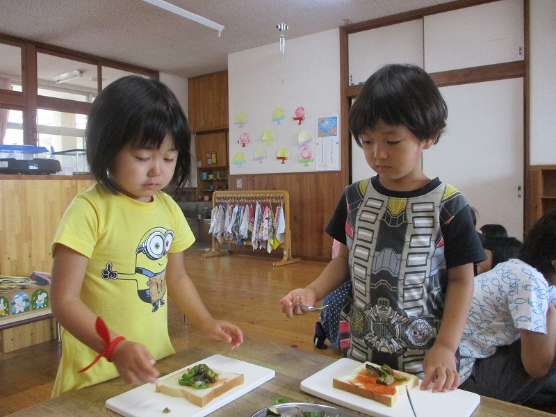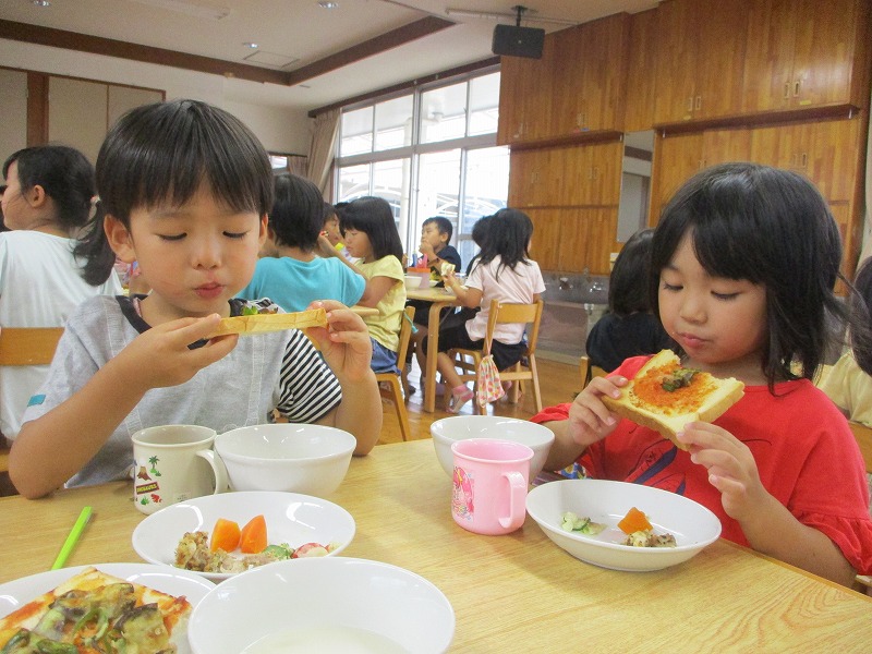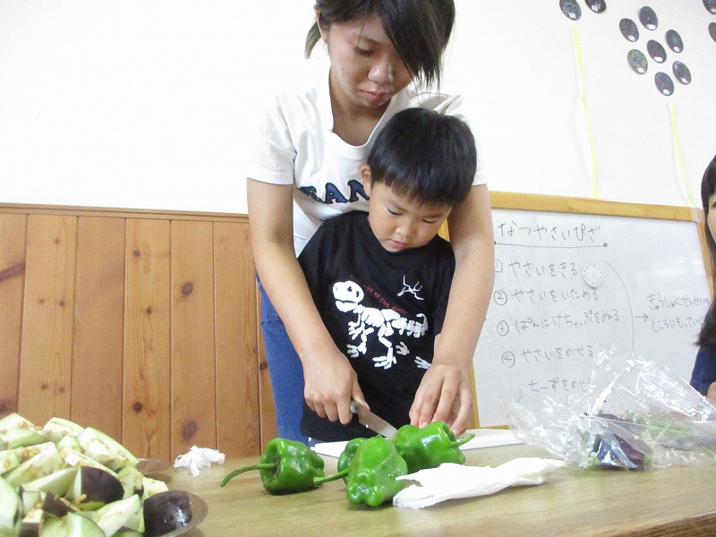 2019年08月27日 ピザ作り 4歳児 ほし 昨日、ほしぐみの畑からたくさんピーマンとナスが収穫できたので、今日は給食にピザを作りました。 「今日はピザつくるよ!」と知らせると、大喜びのほしぐみさん。 まず、包丁で慎重に野菜を切りました。 野菜が切り終わると、次は炒めます。 「わー、いい音がしていておいしそう♪」 野菜に火が通ると、パンにケチャップを塗って、その上に炒めた野菜、チーズをのせて完成です☆ 給食室でこんがり焼いてもらうと、こどもたちも完食でした♪ 一覧へ戻る