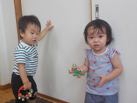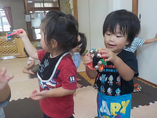 2019年08月29日 りんりんりん 1歳児 ゆき 今日は鈴で遊びました。 "幸せなら手をたたこう”や"手をたたきましょう”など 手あそびうたや季節のうたを歌った後、 こどもたちに「次は何のうた歌う?」と聞くと 「カエル!」と答える子が多かったです。 その後数人ずつそらぐみやつきぐみに遊びに行き、 合奏を聞いてもらいました。 また他のクラスに遊びに行こうね。 一覧へ戻る