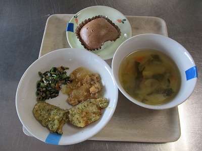 2019年09月04日 給食室(今日の昼食・おやつ) 給食室 昼食 ・ごはん ・魚の磯辺揚げ ・冬瓜の煮物 ・えのき納豆 ・油揚げのみそ汁 おやつ ・ミロ蒸しパン ・牛乳 えのき納豆はえのきたけ、小松菜、にんじん、納豆、ごまが入っています。 えのきたけをなかなか和え物には入れないですが、さっと茹でるとねばりがでて旨みがアップしますよ!!ぜひご家庭でも作ってみてくださいね。 一覧へ戻る