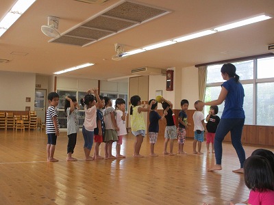 2019年09月05日 ボール送り 4歳児 ほし 昨日は、ホールで『ボール送り』をして遊びました。 一列に並んで、曲の速さに合わせて後ろの友だちにボールを送っていきます♪ 簡単なルールですが、みんなで出来るあそびを楽しむこどもたちでした☆ 一覧へ戻る