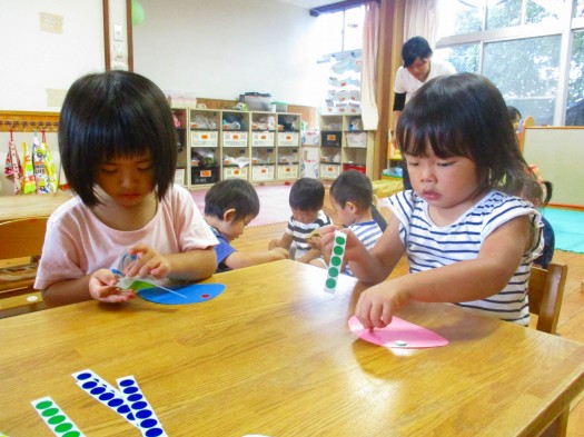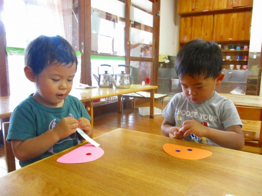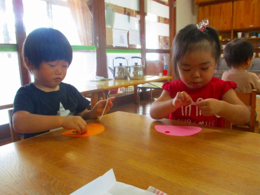 2019年09月06日 き、き、きのこ~♪ 2歳児 にじ シール貼りをしてきのこを作りました。 好きな色の画用紙と丸シールを選んでペタリ! 春から製作などで何度もシール貼りをしているので、 あっという間に貼り終えて嬉しそうに「できた!」と見せていました。 完成したきのこは、ホールに飾るので、お楽しみに♪ 一覧へ戻る