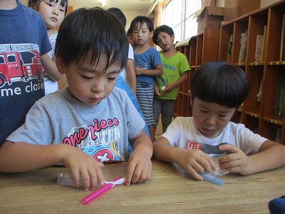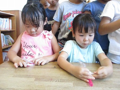 2019年09月09日 自分で結んで 4歳児 ほし 自分で袋が結べるようになりました。 そこで、トンボの製作では ストローにすずらんテープをくくり、 羽にしました。 キュッとくくって羽の完成です☆ 目を付けるとトンボになりました。 出来あがったトンボを持って ♪とんぼのめがね♪を各クラスへ披露しに行きました。 3番まで覚えて口ずさむ姿が可愛らしいです。 保育室に飾っているので見てくださいね♪ 一覧へ戻る