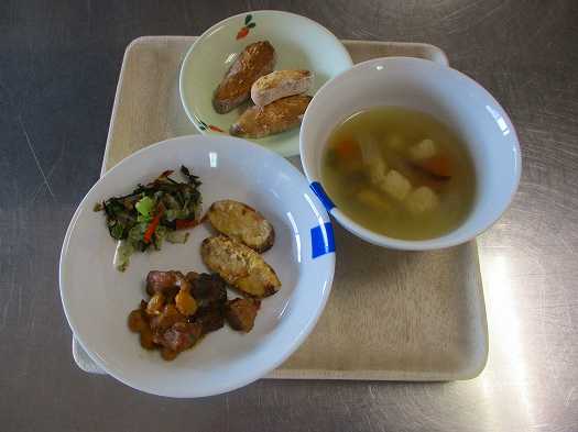 フライドごぼうは下味にしょうゆをつけて、片栗粉をまぶし揚げています。ご家庭で作るときはフライパンに多めに油をひいて揚げ焼きしても良いですよ。あごを鍛えるかみかみメニューにもなります。