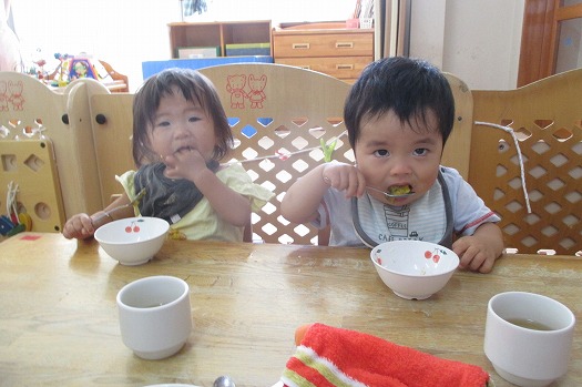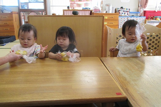2019年09月19日 かぼちゃ白玉団子 0歳児 はな 昨日切ったかぼちゃを給食室で湯がいてもらい、いざもみもみ! 一人一つの袋に材料を入れ、保育者が見本を見せると真似して揉んでいました。 気持ちがいい感触に口に入れようとする姿もありました。 出来上がった団子は苦手な子もいましたが、おいしそうに食べるこどもたちでした。 一覧へ戻る