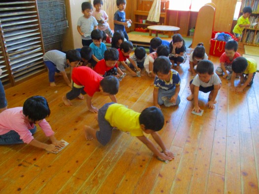 2019年09月25日 ピカピカ 3歳児 つき 今日は明日のお招きに向けて、大掃除をしたつき組さん! 新聞紙を折りたたみ水で濡らして準備万端♪ 床を拭いたり、窓を磨いたりとそれぞれに掃除をする子どもたち。 「ここも汚れてるよ」「この隅が汚いよ」とそれぞれに声をあげて綺麗にしていきました。 掃除が終わると、「床が気持ちいい」「ピカピカ」と次々に寝ころんで確かめていました。 明日が待ち遠しい子どもたちです。 一覧へ戻る